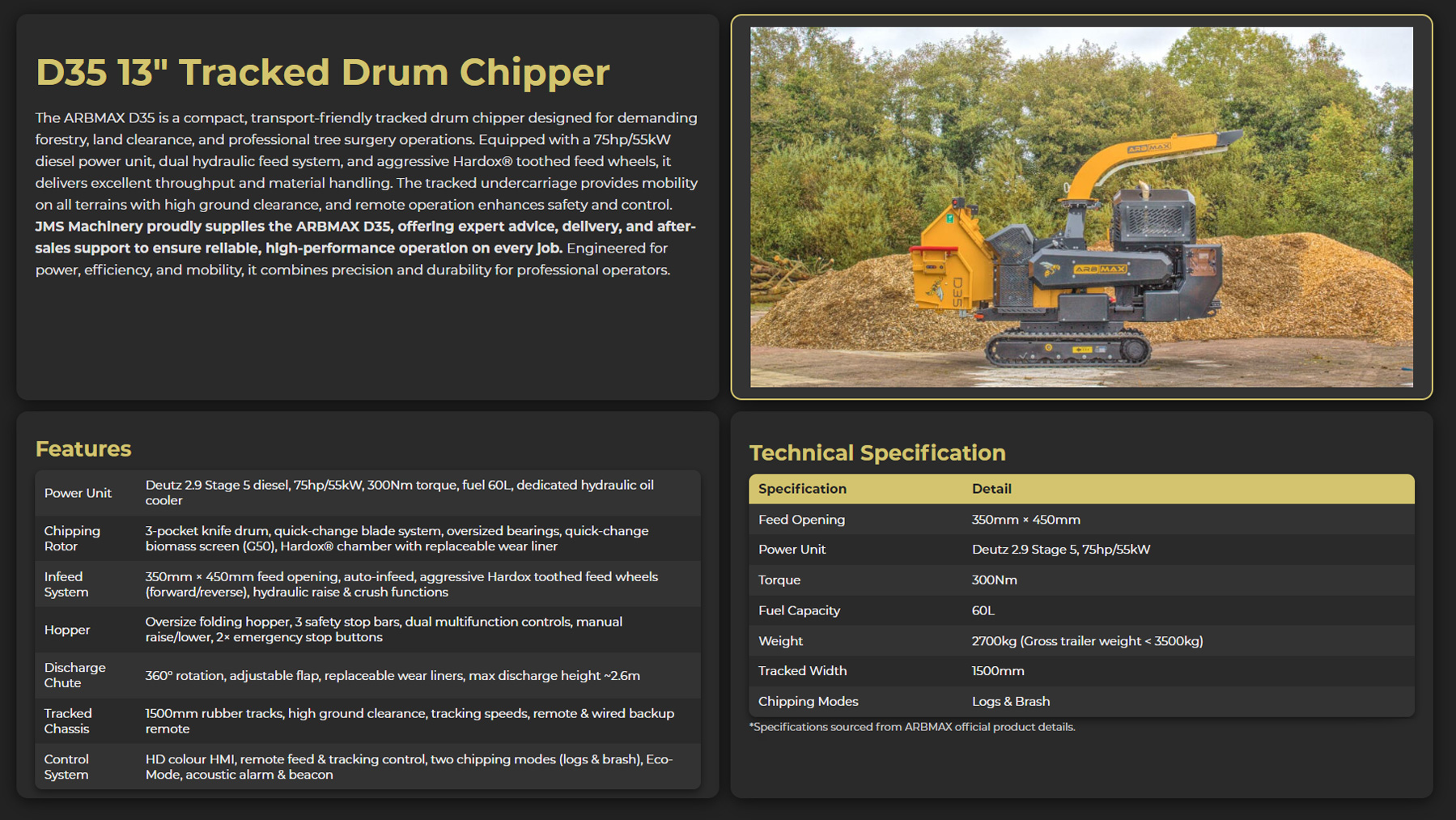 The ARBMAX D35 Drum Wood Chipper is a compact yet powerful tracked wood chipper designed for professional use in forestry, land clearance and arboriculture. Powered by a 75 hp (55 kW) Stage 5 Deutz diesel engine, it delivers exceptional pulling and crushing force via a generous 350 mm × 450 mm feed opening and a robust dual‑drive, Hardox‑toothed feed system. The oversized folding hopper, auto‑infeed system and triple safety stop bars ensure efficient and safe operation, while the three‑knife drum, Hardox® chamber construction and quick‑change blades and biomass screen provide consistent chip quality and long component life.